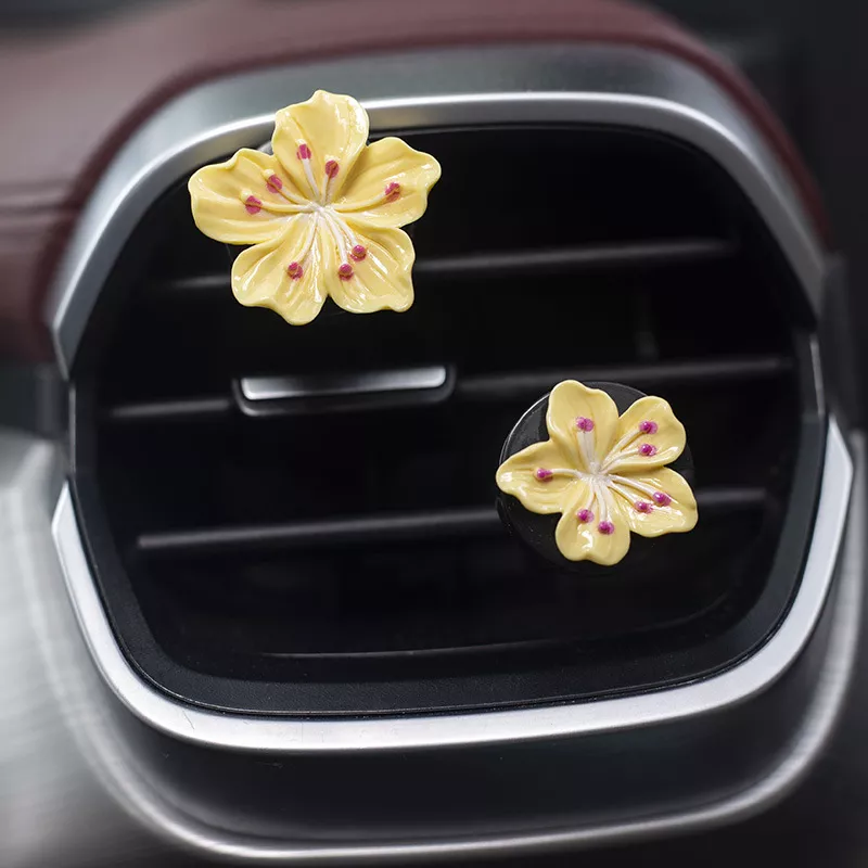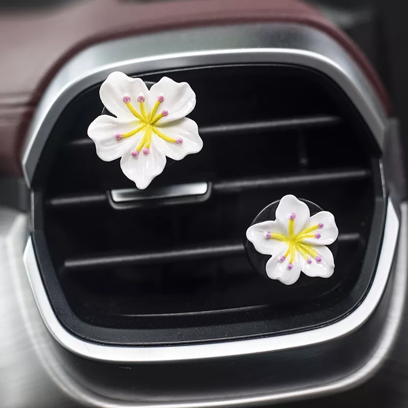 Crafted from durable resin, each set includes two flower-shaped clips in two sizes for a layered and dimensional look. The large flower measures approximately 1.3 inches in diameter, while the smaller one is about 1 inch—perfectly sized to stand out without being overwhelming. Their clip-on design makes them easy to attach to any car air vent without tools or adhesives. As air flows through the vent, it carries the subtle scent with it, freshening your space while elevating the look of your dashboard.