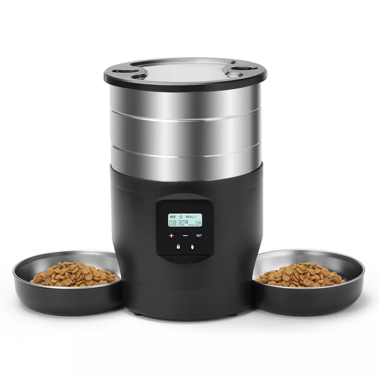 What makes this automatic feeder special is its intelligent design. With its generous capacity and portion control, you can prevent overfeeding or underfeeding and maintain your pet’s healthy eating habits. The dual stainless steel bowls offer a clean, rust-resistant solution for food or food-and-water combos. The quiet motor dispenses food smoothly without scaring your pet, and the anti-clog system ensures every portion is delivered without fail.