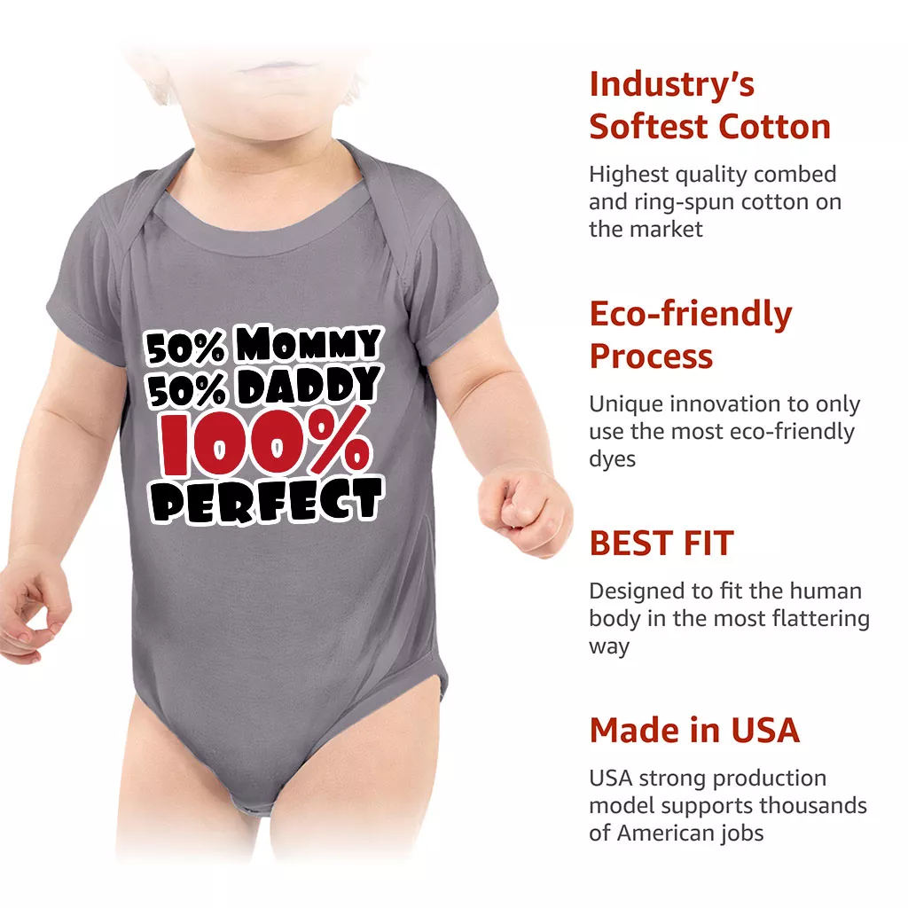 50 Mommy 50 Daddy 100 Perfect Baby Jersey Onesie is proudly made with 7x less water than average manufacturers,