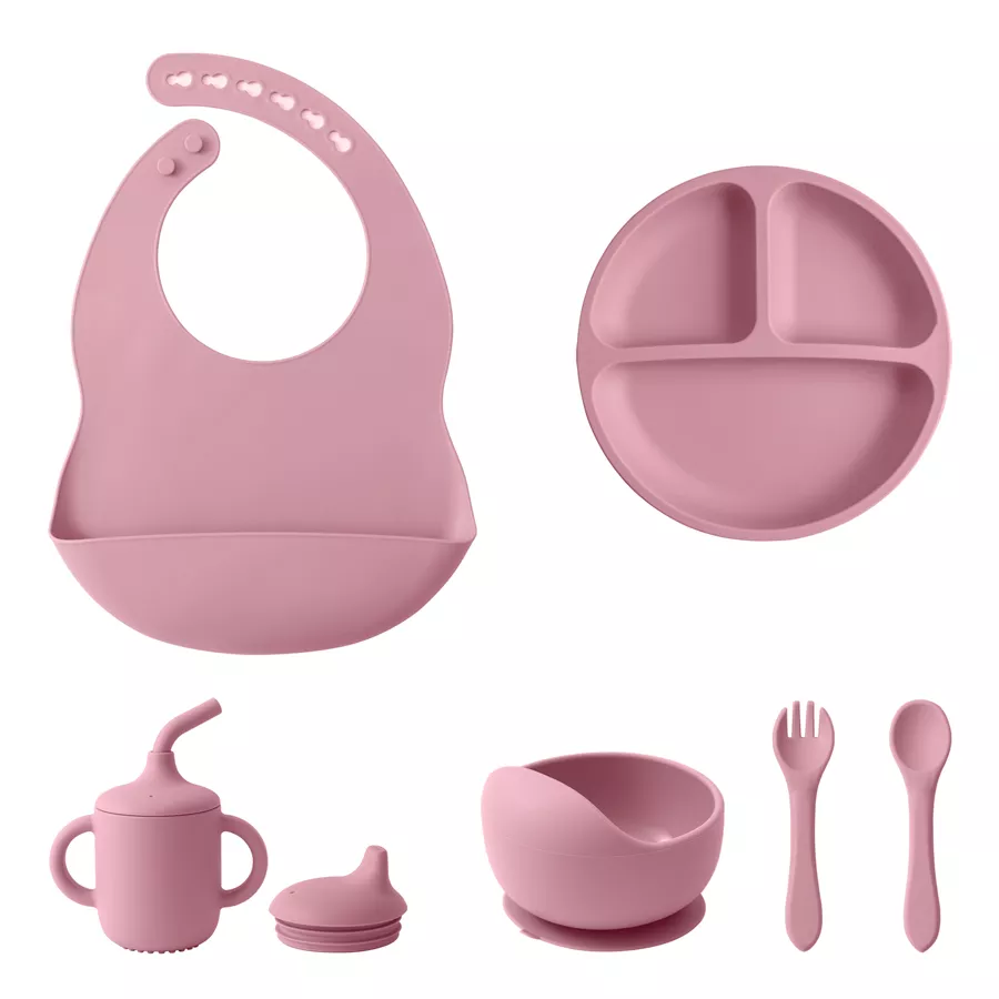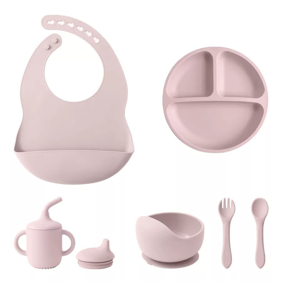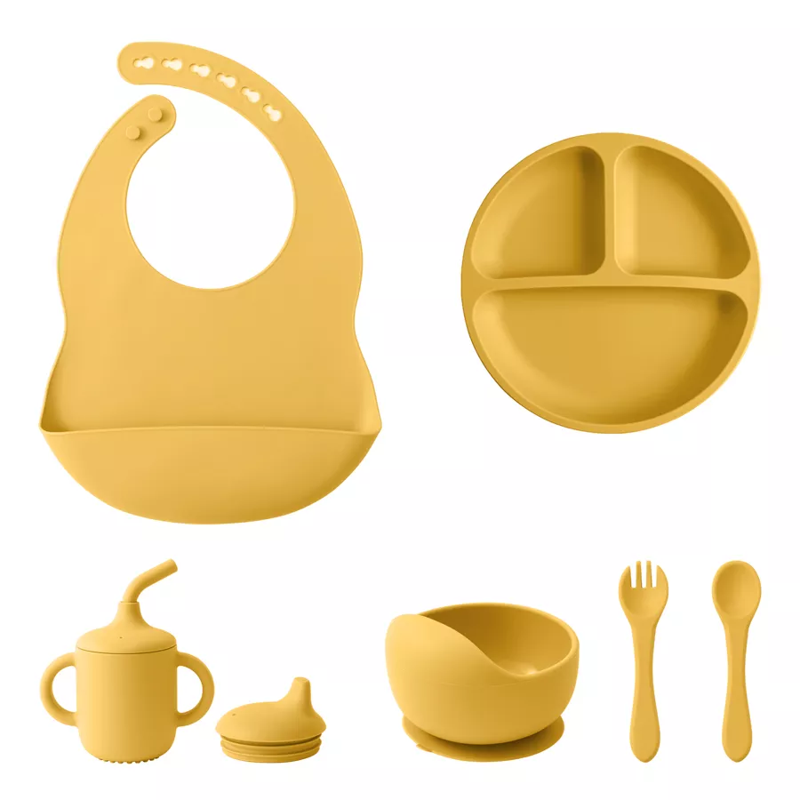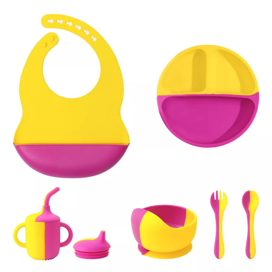 6PCS Silicone Baby Feeding Set with Suction Bowl, Bibs, Cups & Utensils