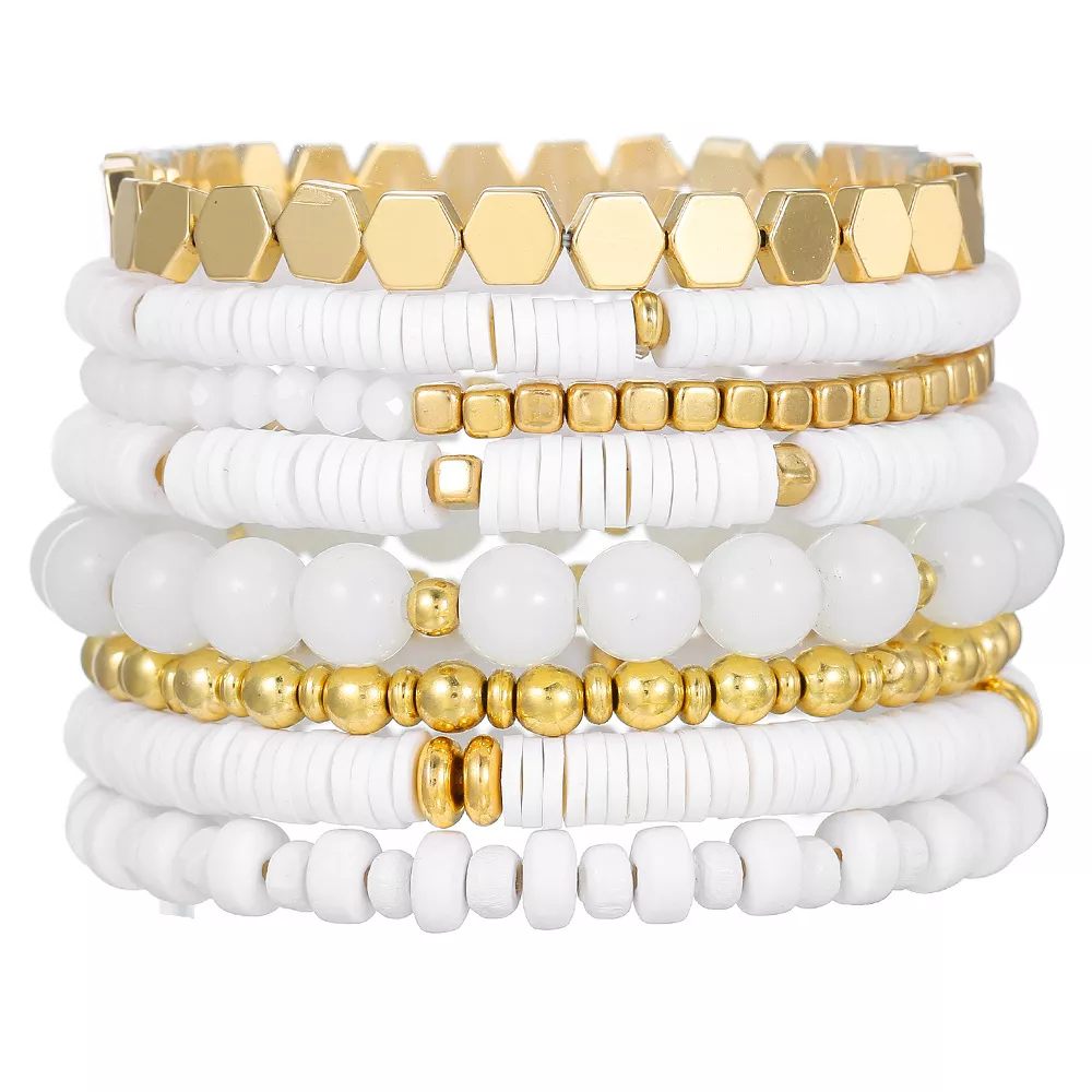 8pc Boho Gold Heishi Clay Bead Bracelets Set – Stackable Surfer Style