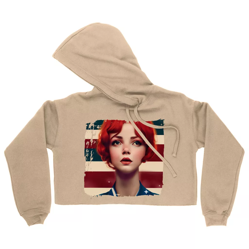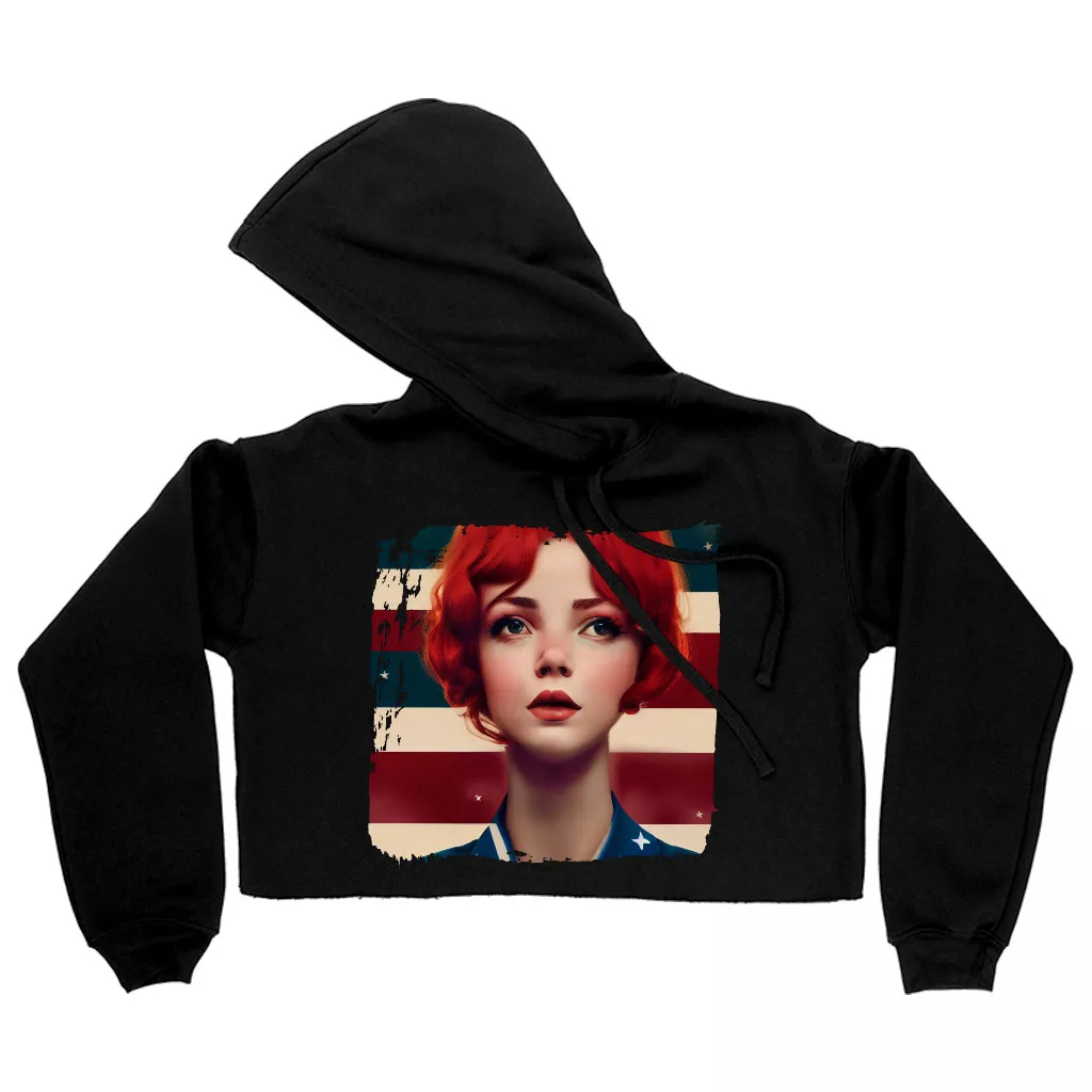 American Flag Design Women’s Cropped Fleece Hoodie – Themed Cropped Hoodie for Women – Graphic Hooded Sweatshirt