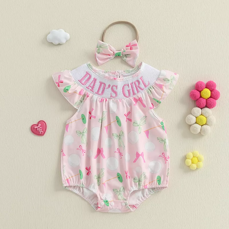 Baby Girl Father’s Day Romper with Golf Print & Bow Headband