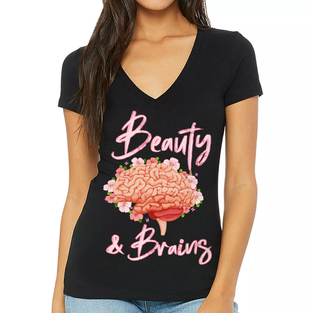 Beauty and Brains Women’s V-Neck T-Shirt – Floral V-Neck Tee – Illustration T-Shirt