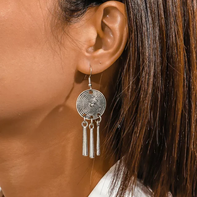 These drop earrings are crafted from high-quality zinc alloy with a beautiful antique silver-tone finish. The round shape, paired with fine tassel detailing, gives a graceful swinging motion that adds life and personality to your ensemble. The design reflects traditional Tibetan aesthetics, making each piece feel like a little work of wearable art.