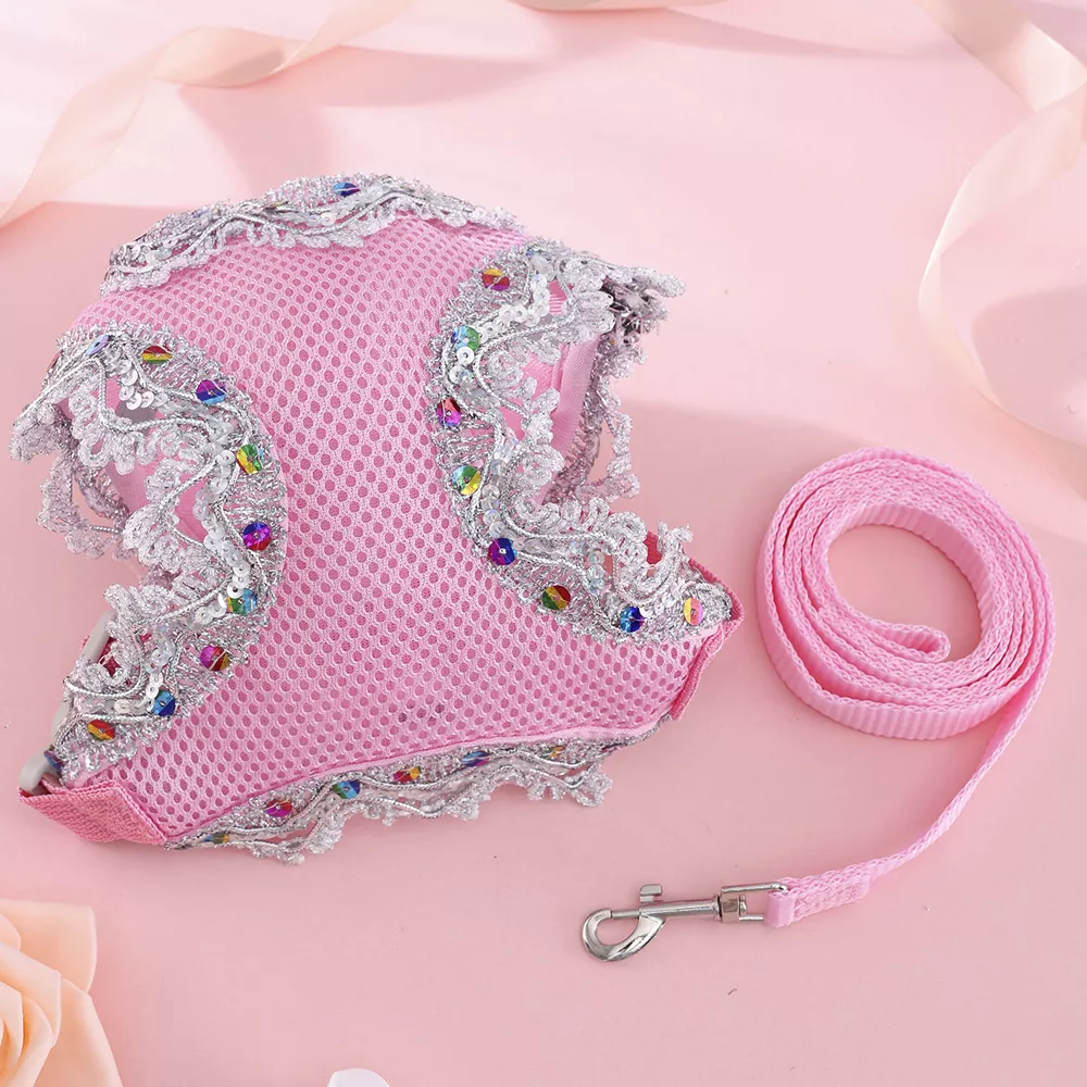 Give your small dog or cat the perfect combination of style and comfort with this breathable harness set featuring a delicate gold thread lace design. Crafted from lightweight mesh fabric, this pet vest is gentle on your furry friend’s skin while allowing air to flow freely, keeping them cool and comfortable during every walk. The soft chest vest fits snugly without restricting movement, making it ideal for daily outings, playtime, or even special occasions when you want your pet to shine.