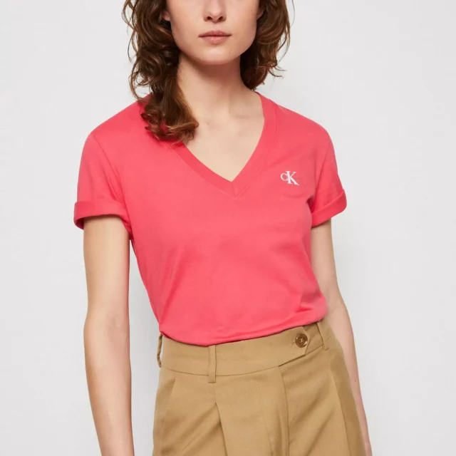 Don’t miss out on the Calvin Klein Jeans Women’s Pink V-Neck T-Shirt—a staple for effortless style and unmatched comfort. Pair it with your favorite bottoms for an easy, chic look. Add this wardrobe essential to your collection today and redefine your casual style!
