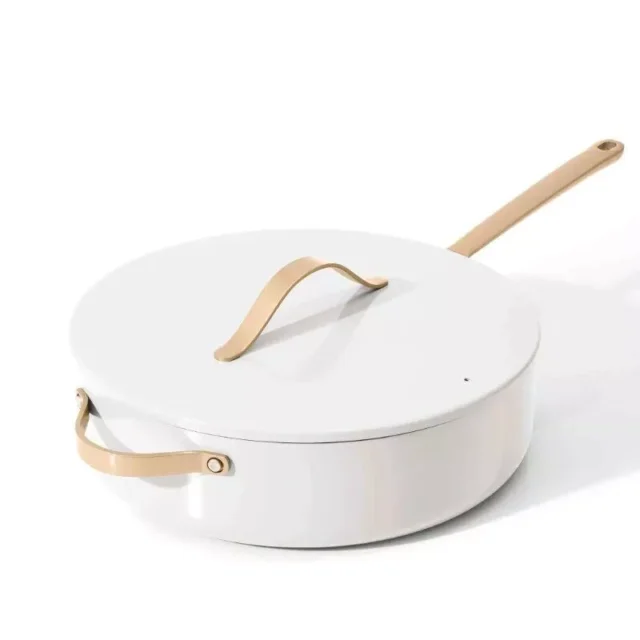 Our ceramic sauté pan is much more than a cooking tool; it’s an investment in your kitchen’s aesthetics and your health. The eco-friendly, non-stick coating ensures a safer cooking environment, free from harmful chemicals. The pan’s efficient heat distribution reduces cooking time and energy usage, making it a sustainable choice. Its elegant design, featuring a sleek white icing finish and gold accents, makes it a stylish addition to any kitchen decor.