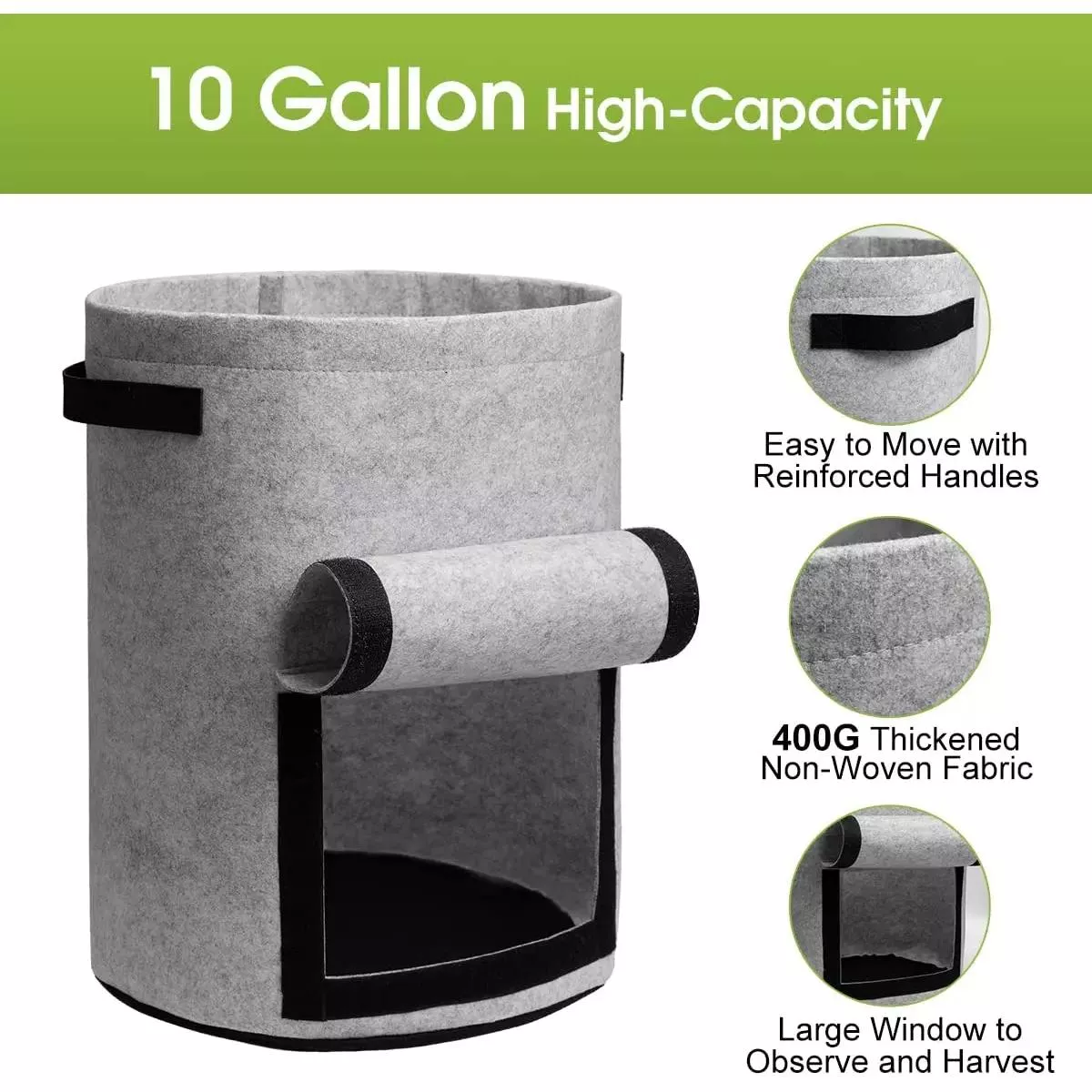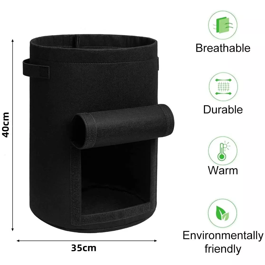 Crafted from durable and breathable PET felt fabric, these grow bags are built to last through multiple planting seasons. They’re resistant to heat and cold, ensuring your plants thrive in all weather conditions. The built-in side flap offers easy access to harvest your potatoes without disturbing the plant’s roots, while the reinforced double handles make moving the bags around effortless—even when full of soil and produce.