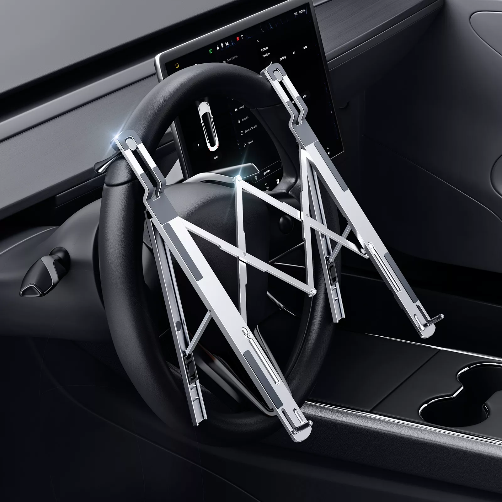 Stay productive wherever you go with this foldable and adjustable car steering wheel laptop stand. Whether you’re a busy professional on the road, a remote worker, or a student between classes, this handy stand lets you comfortably work from your car with your laptop or tablet. It securely attaches to your steering wheel and creates a stable platform, so you can type, read, or video conference without struggling for space. Its compact, foldable design makes it easy to store when not in use, while the sleek aluminum construction ensures durability and style.