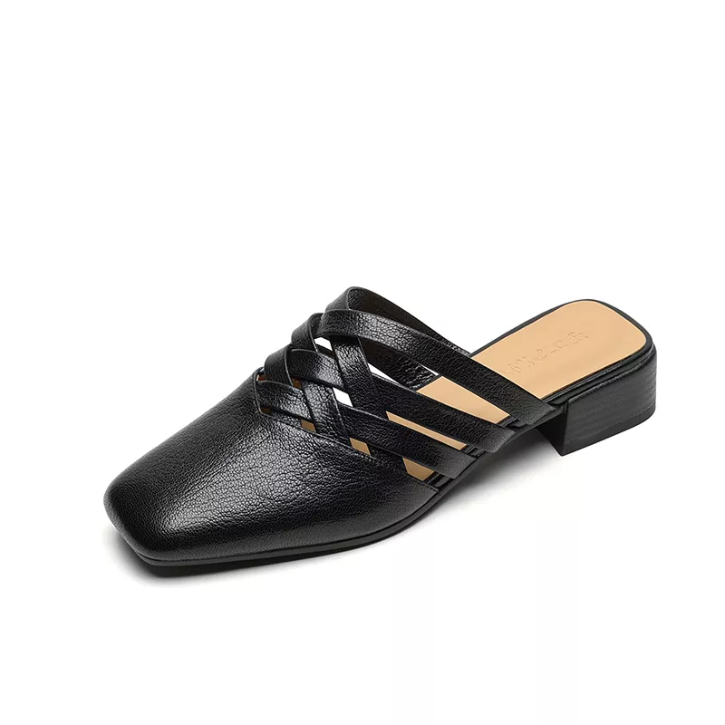 Genuine Leather Retro Low Heel Square Toe Women’s Mueller Slippers