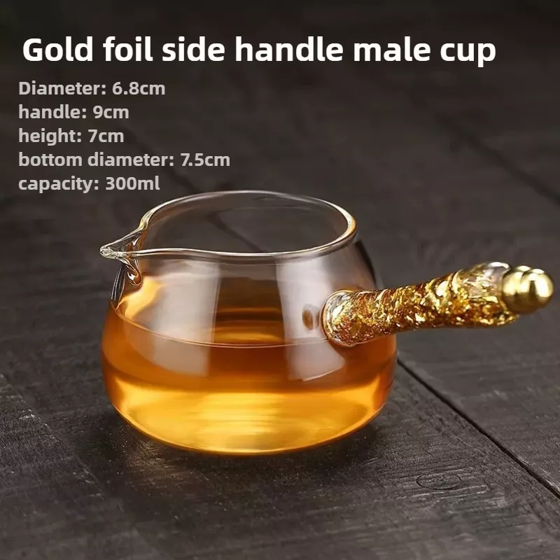 Gold Foil Glass Fair Cup with Side Handle – Heat-Resistant Teaware 10oz