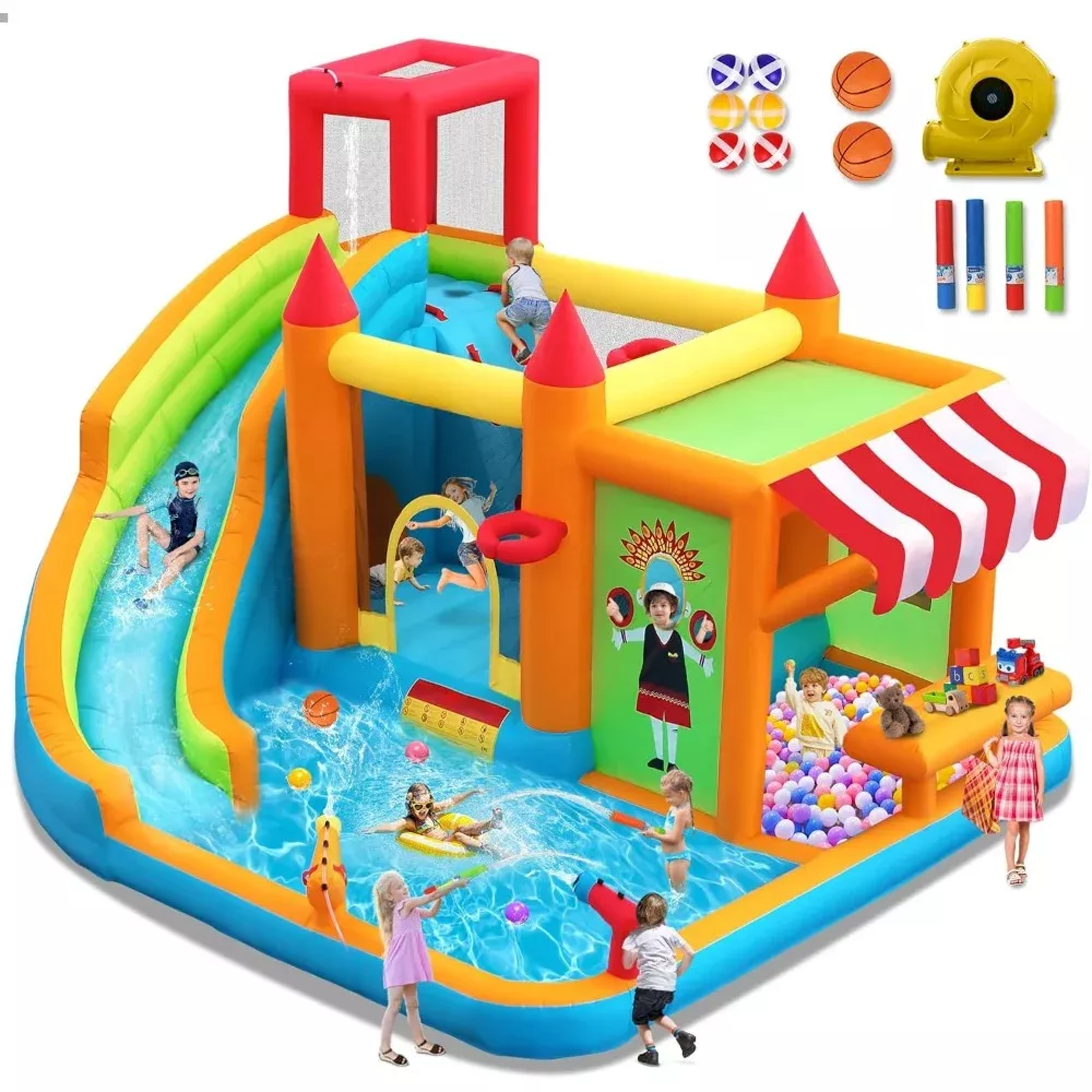 Create unforgettable summer memories with the ultimate inflatable bounce house water slide—a complete outdoor play center that turns your backyard into a private amusement park. This action-packed 10-in-1 bouncer features everything kids love: a long slide, splash pool, climbing wall, water cannons, basketball hoops, sprinklers, a tunnel, and even a pretend market stand for imaginative play. It’s the perfect way to keep kids active, engaged, and laughing all day long.