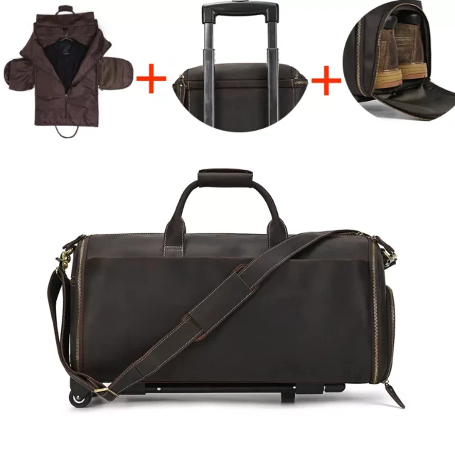 Not just another travel bag—this one is built to impress and perform. The crazy horse leather makes each bag slightly different, giving it a character all its own. It’s scratch-resistant, water-resistant, and tough enough to handle years of travel. The rolling function saves your shoulders, while the separate compartments keep you organized.