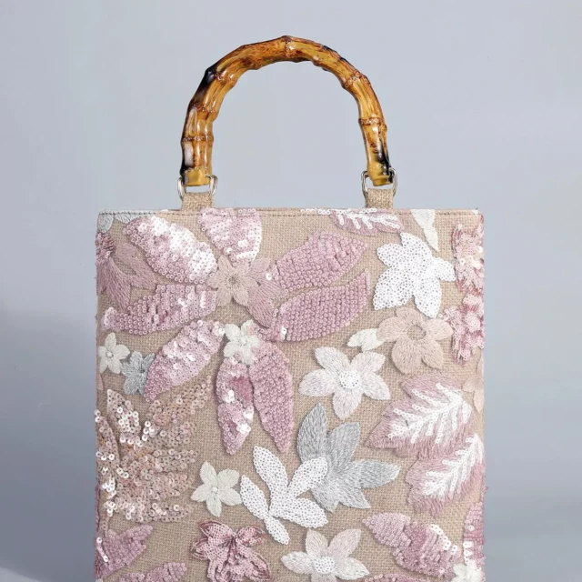Sequin Embroidered Linen Tote Bag with Bamboo Handle – Summer Beach Purse