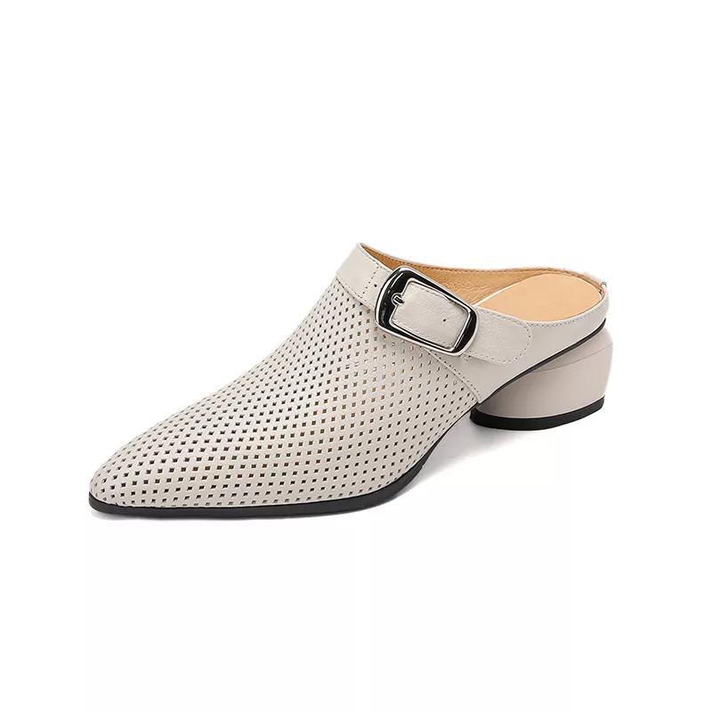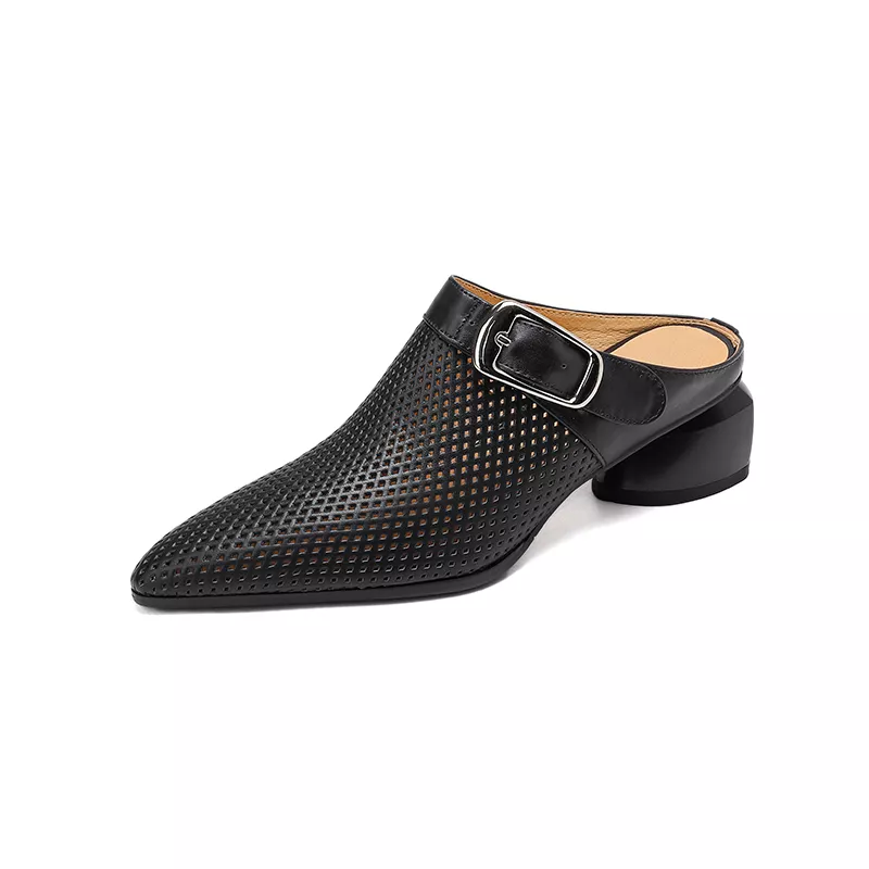 Summer Women’s Genuine Leather Pointed Toe Hollow Chunky Heel Mules