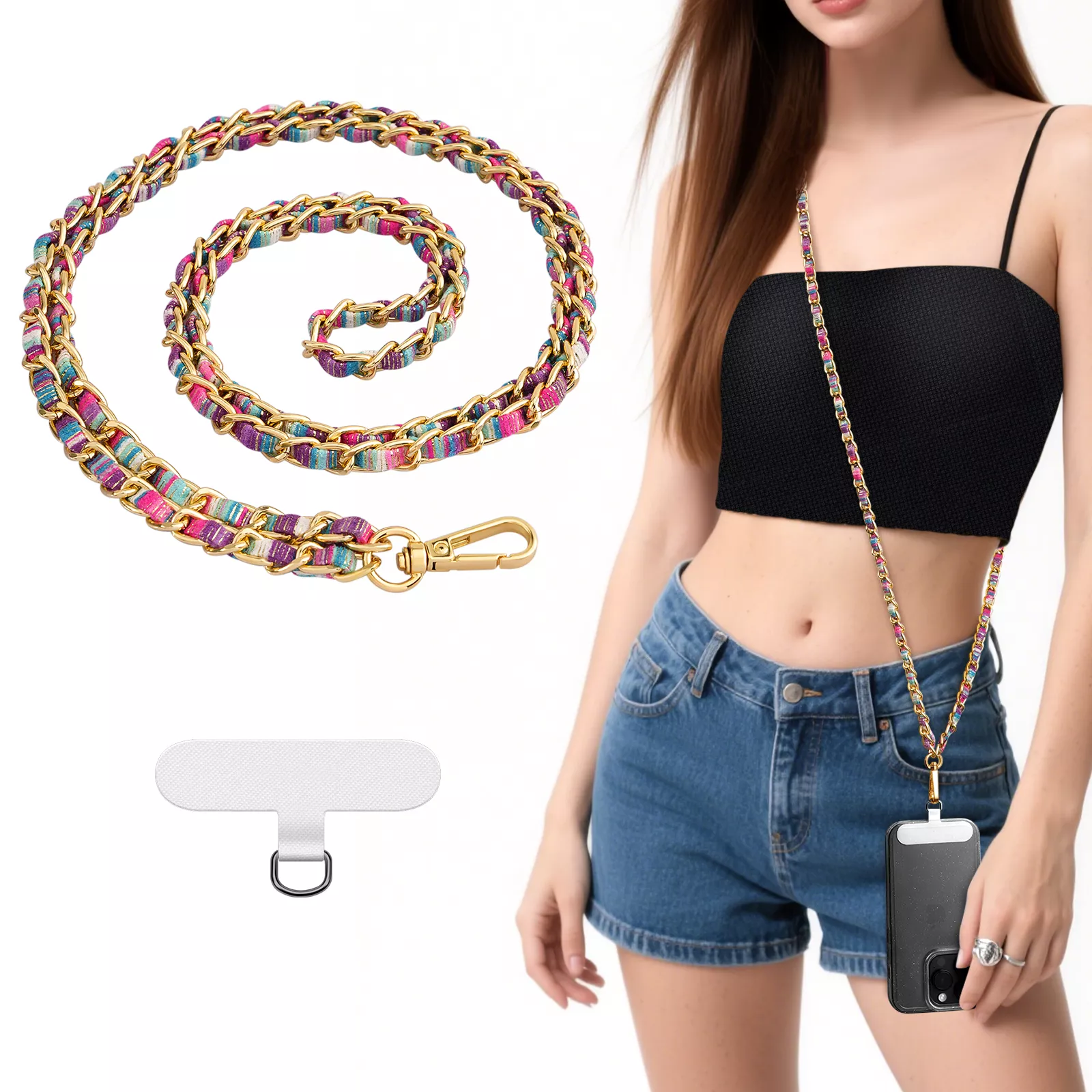 This phone strap is made from high-quality metal and durable polyester fabric, ensuring it’s as tough as it is trendy. The 360-degree rotating metal hooks let you access and use your phone without removing it from the strap. Just slide the tether patch through the charging hole of your phone case — no tools required — and you’re ready to go. The design supports both wired and wireless charging without removing the patch, and it fits most full-coverage phone cases, including iPhone and Samsung models.