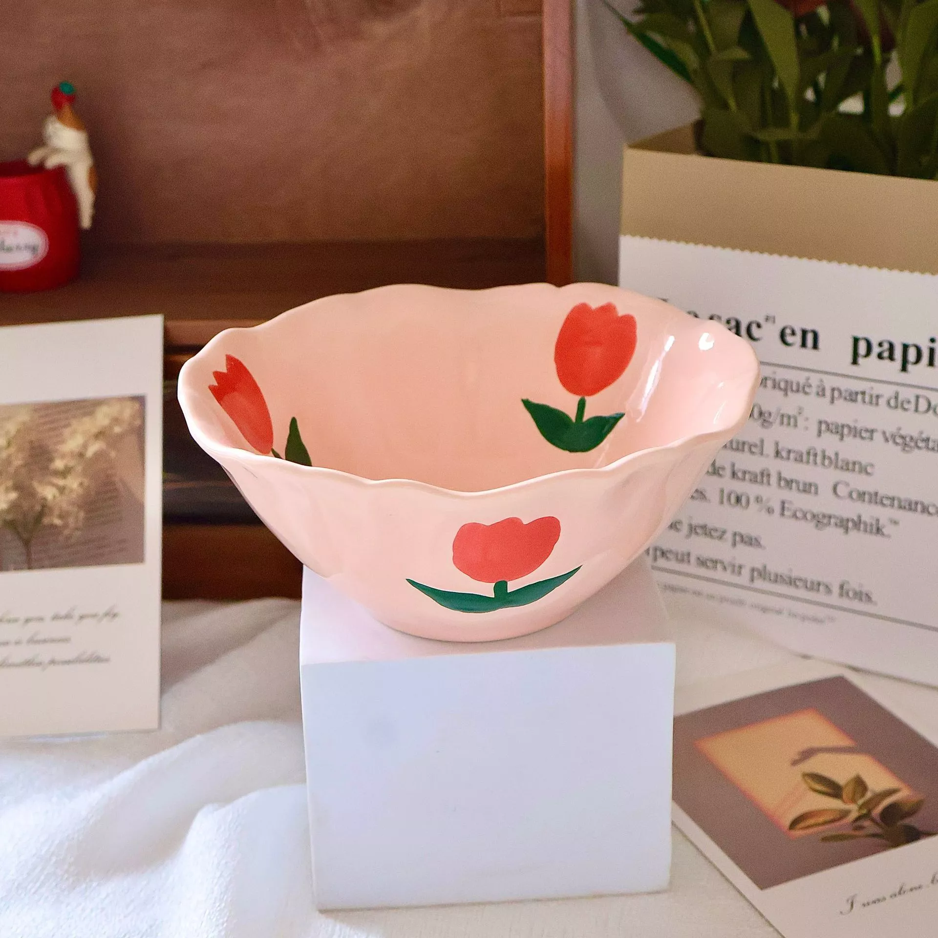 Unlike mass-produced dinnerware, this bowl offers a touch of artistry and individuality. Its irregular shape and detailed floral painting bring a handcrafted charm that makes it more than just a piece of tableware—it’s a conversation starter. Whether you’re setting the table for a relaxed breakfast or adding a pretty touch to your open shelves, this bowl will make an impression.